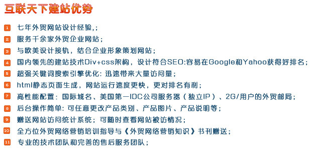 互联天下通过7年来不断的努力,积累丰富的海内外资源,用我们多语言建站与推广的优势,来帮助您度过难关,为您开辟广阔的国际市场,给您赢得更多的订单 |