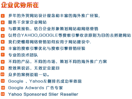 1)公司已为众多的企业在Google/Yahoo左侧成功排名,成功率在行内堪称少见,关键词排名均在前3页,